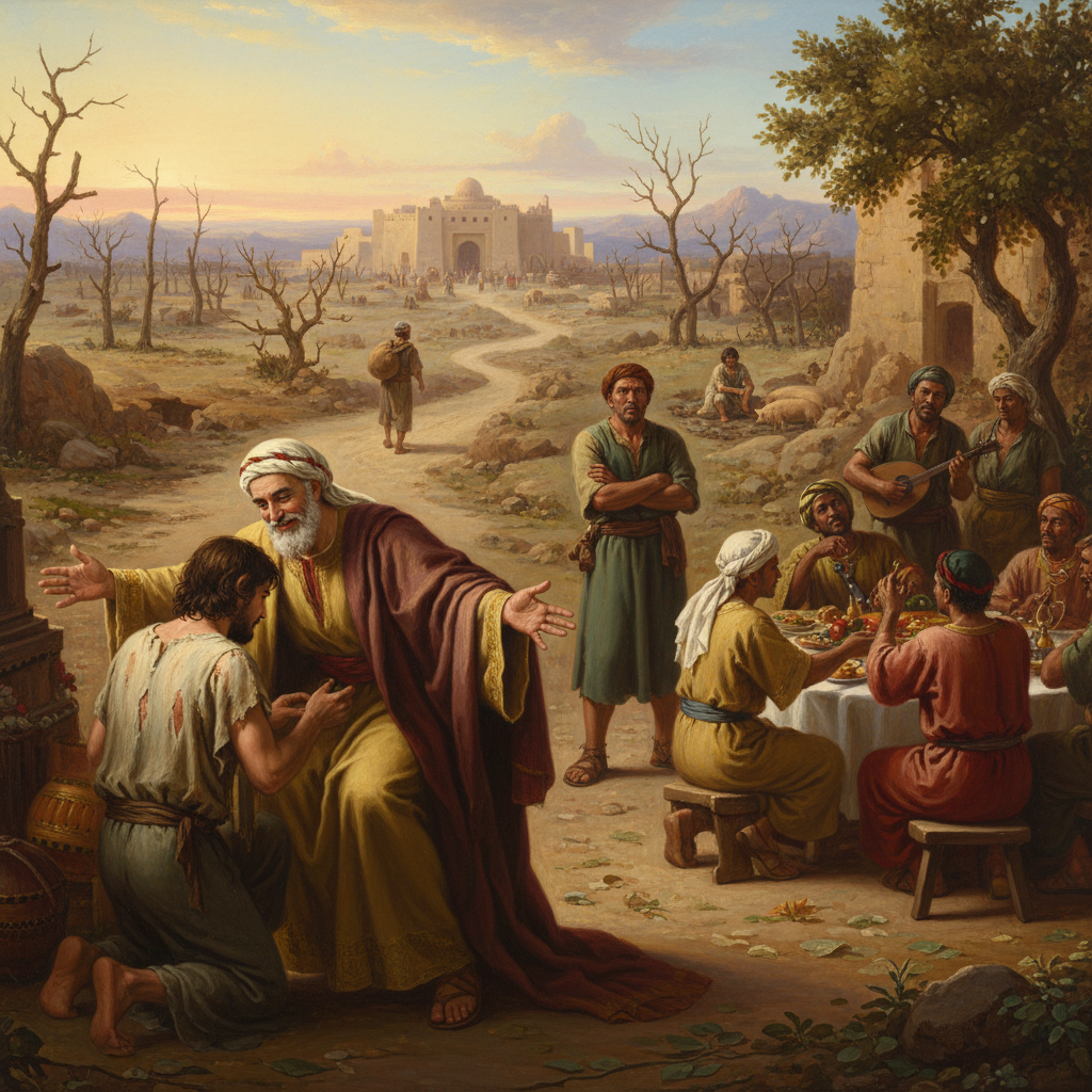 The Going Away: The text describes that ‘The Pharisees and scribes began to complain.’ In the parable, the older son develops resentment towards his prodigal younger brother who just returned. The Pharisees and scribes resemble the older son by distancing themselves from Jesus in resentment because he ‘welcomed sinners and ate with them.’ In sum, those who were considered righteous stood apart from Jesus in resentment.