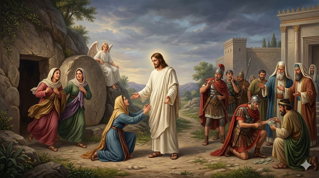 The Path of Authorities: In total contrast to the testimony of women, the authorities want to hide the truth of Christ’s resurrection by any means. This is where money enters the scene. Earlier, they paid money to Judas to betray Jesus. Now they pay the soldiers ‘a large sum of money’ to distort the truth of Christ’s resurrection. ‘Repeat a lie often enough, and it becomes the truth’ was the law of propaganda for the Nazi Goebbels. Now the propaganda of religious leaders meets the power of money to silence the truth. However, the truth comes alive in the person of Christ. Their methods of coercion and deception fail in the face of Christ, the Truth. Christ is risen, and the truth cannot be shut.